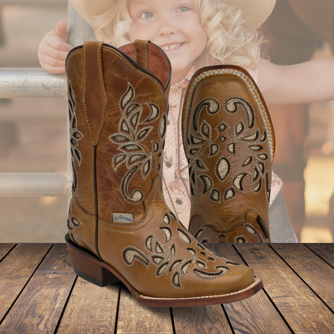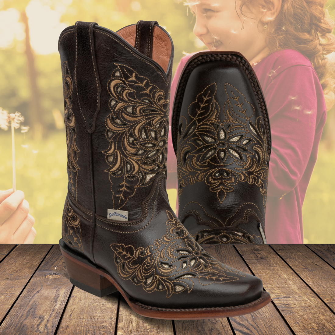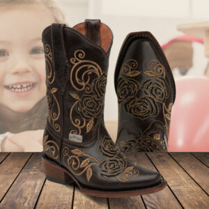 Horma: 250J Modelo Country Piel Crack Color Café: Para Niña 100 % de piel original, diseño hecho a mano con bordado, punta semi cuadrada y suela de piel.